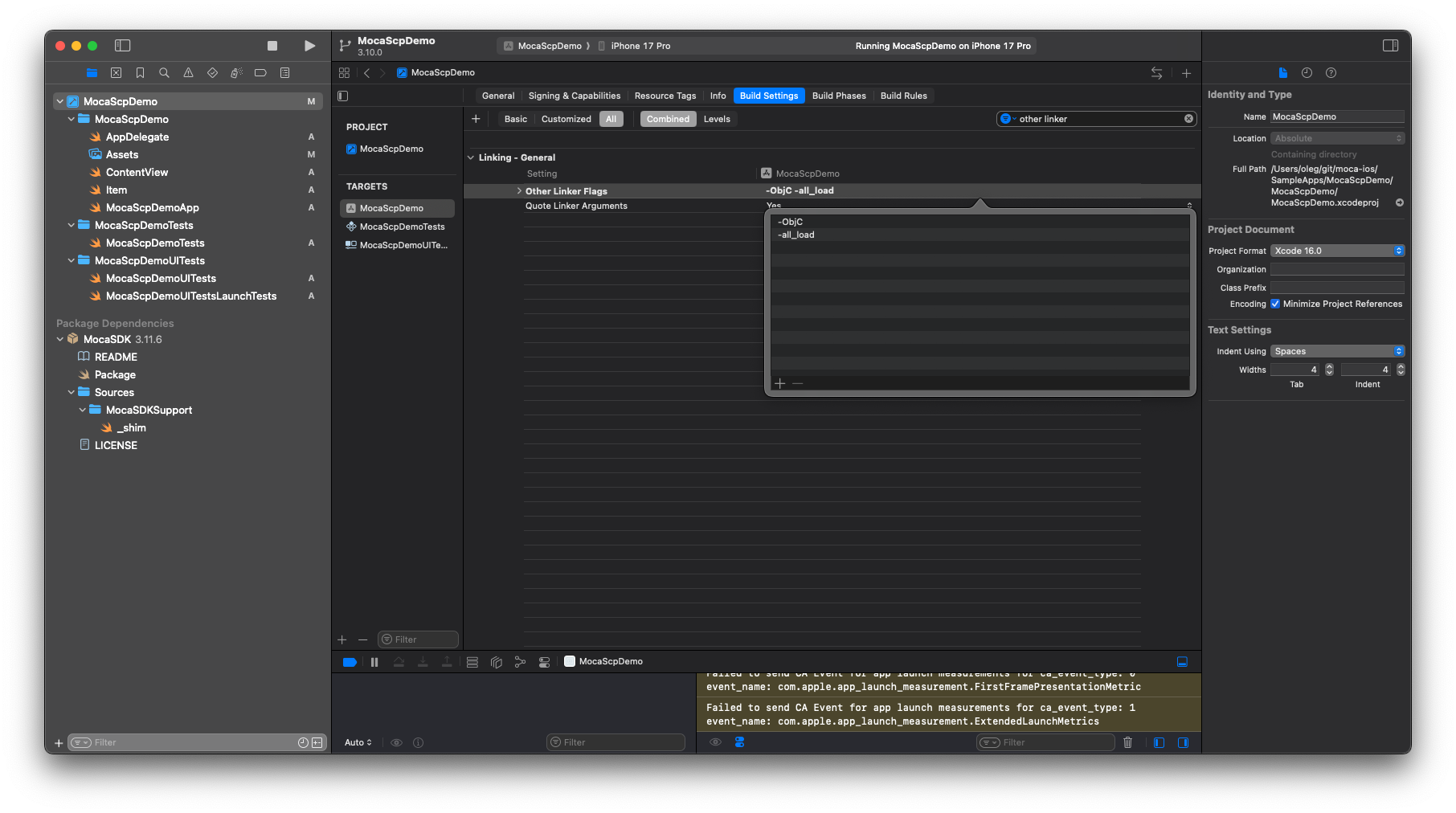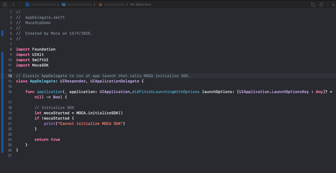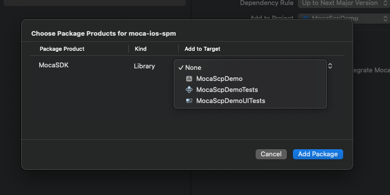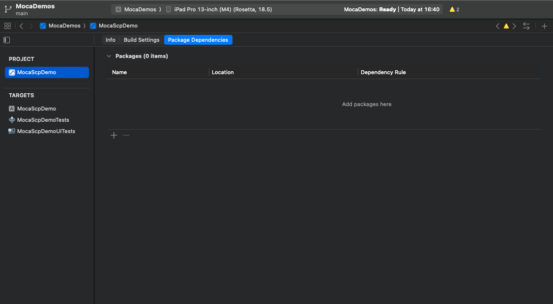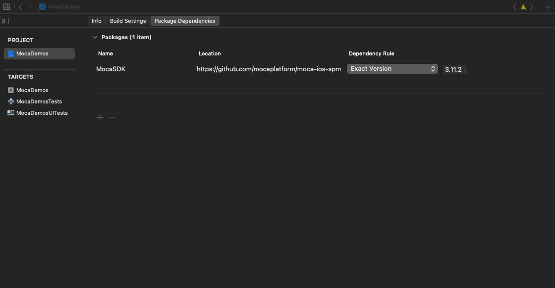 - The MocaSDK package appears under Package Dependencies in Xcode.