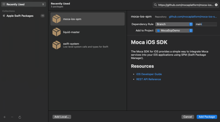You can integrate the MOCA iOS SDK 3.11.0+ into your app using Swift Package Manager (SPM). Follow these steps: